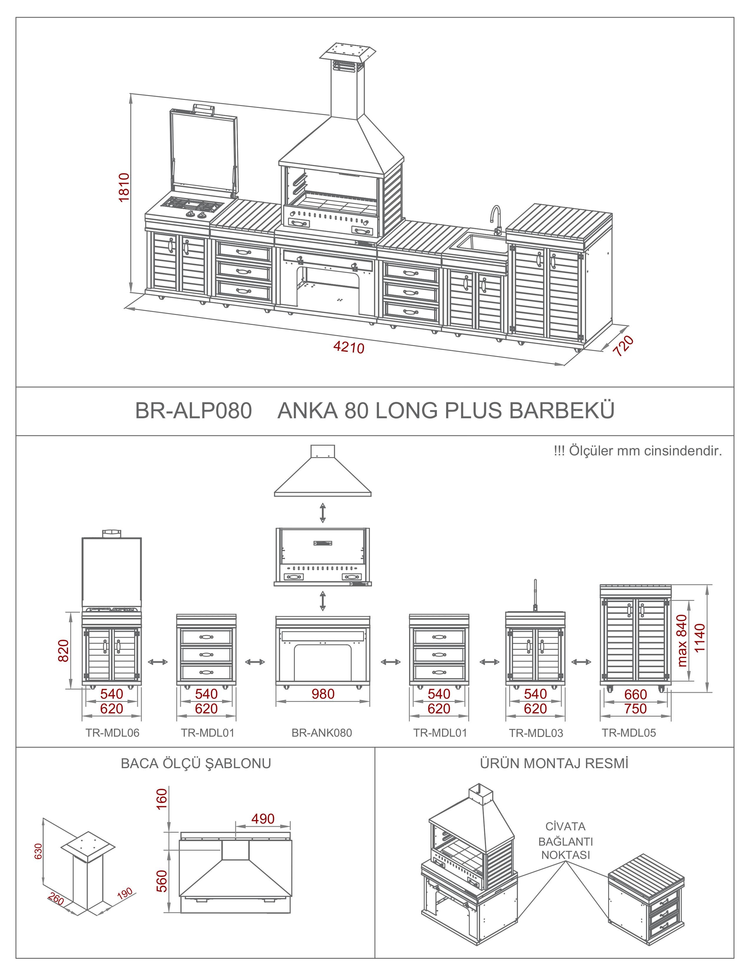 -Ürün içeriği; ocak, 2 adet çekmece, Anka barbekü 40*80, lavabo ve büyük dolap modülü ile beraber 6 modülden oluşmuştur,