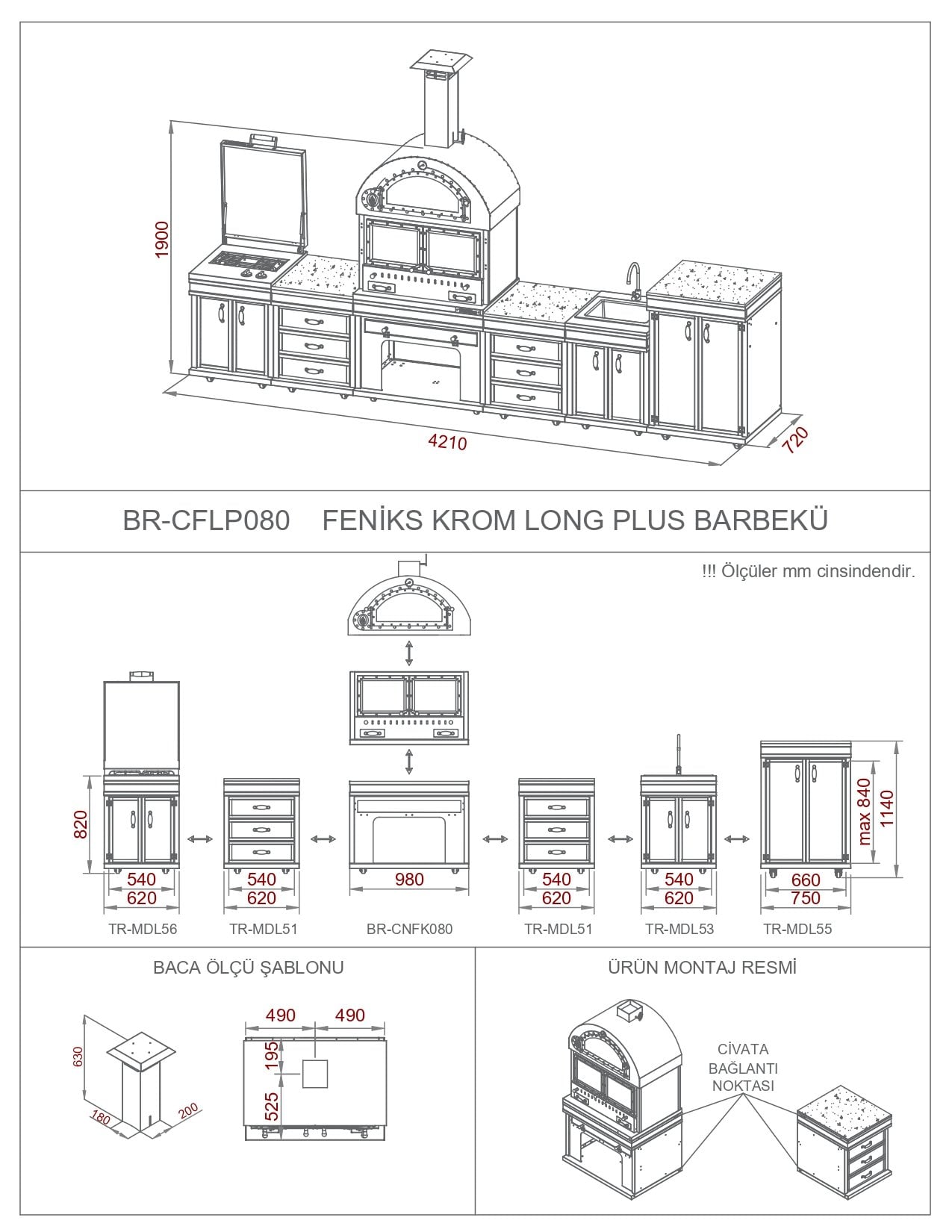 -Barbekü ve modülleri teknik çizimde de belirtildiği gibi yan yana konulup birleştirme noktalarından beraberinde gönderilen bağlantı parçaları ( civata, somun) ile bileştirilmelidir.