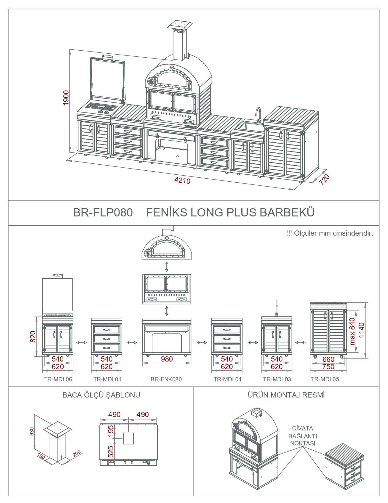 -Barbekü ve modülleri teknik çizimde de belirtildiği gibi yan yana konulup birleştirme noktalarından beraberinde gönderilen bağlantı parçaları ( civata, somun) ile bileştirilmelidir.
